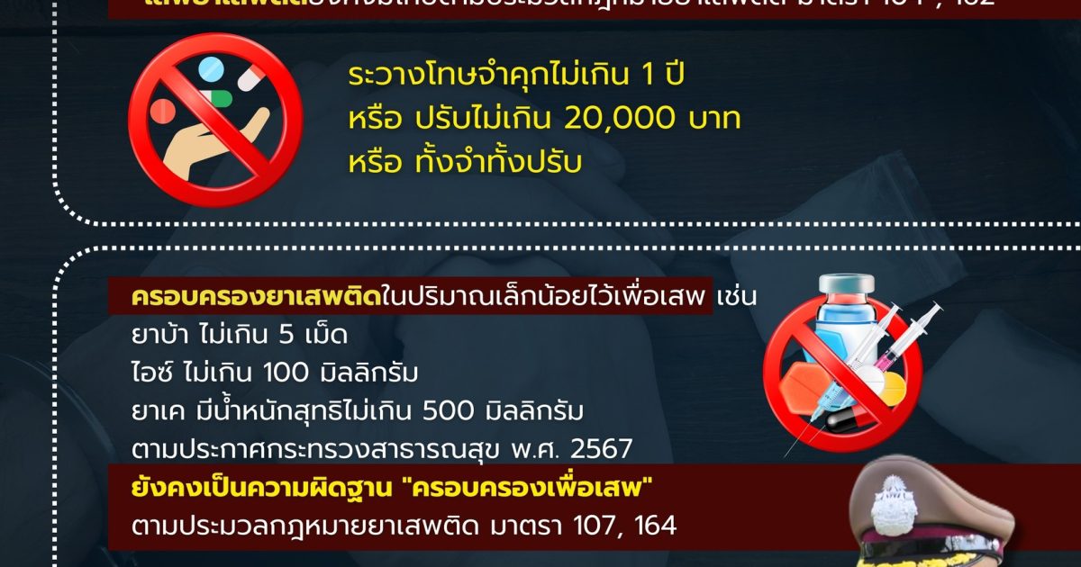 “ส่วนการครอบครองยาเสพติดในปริมาณเล็กน้อยไว้เพื่อเสพ เช่น ยาบ้า ไม่เกิน 5 เม็ด หรือ ไอซ์ ไม่เกิน 100 มิลลิกรัม หรือยาเค มีน้ำหนักสุทธิไม่เกิน 500 มิลลิกรัม ตามประกาศกระทรวงสาธารณสุข พ.ศ. 2567 ยังคงเป็นความผิดฐาน “ครอบครองเพื่อเสพ” ตามประมวลกฎหมายยาเสพติด มาตรา 107, 164 ต้องระวางโทษจำคุกไม่เกิน 2 ปี หรือปรับไม่เกิน 40,000 บาท หรือ ทั้งจำทั้งปรับ แต่หากผู้ครอบครองยาเสพติดไว้เพื่อเสพ สมัครใจเข้ารับการบำบัดรักษา และดำเนินการเข้ารับการบำบัดจนครบถ้วน ก็จะไม่มีความผิด ตาม ม.113 เช่นกัน”