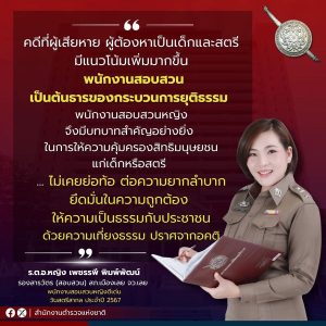 ร.ต.อ.หญิง เพชรรพี พิมพ์พัฒน์ รองสารวัตร (สอบสวน) สภ.เมืองเลย จว.เลย ได้รับรางวัลพนักงานสอบสวนหญิงดีเด่น ระดับรองสารวัตร ด้านการคุ้มครองสิทธิมนุษยชนแก่เด็กหรือสตรี