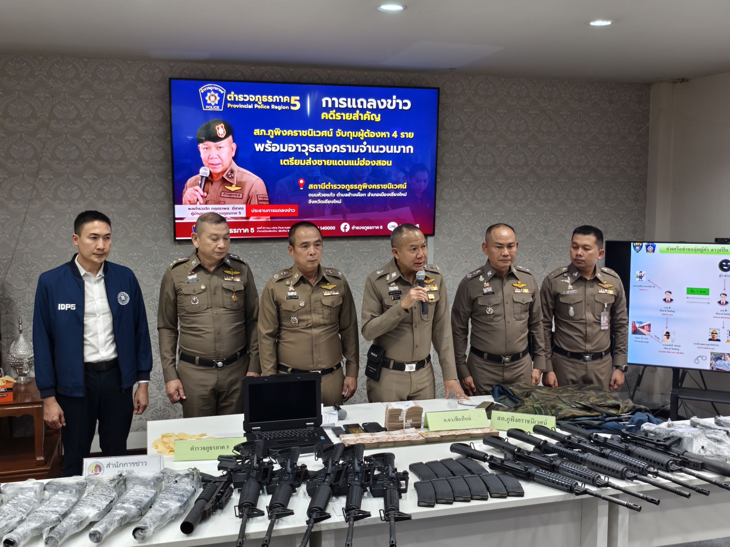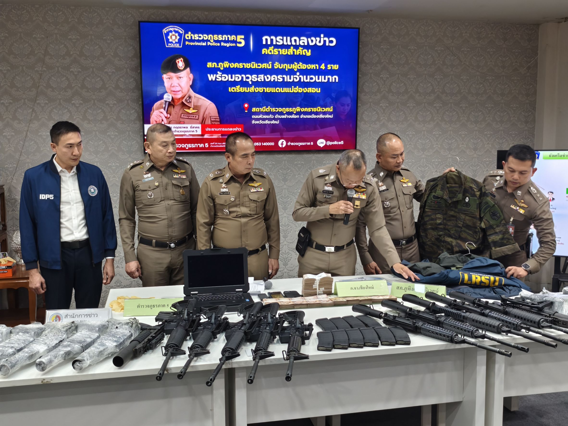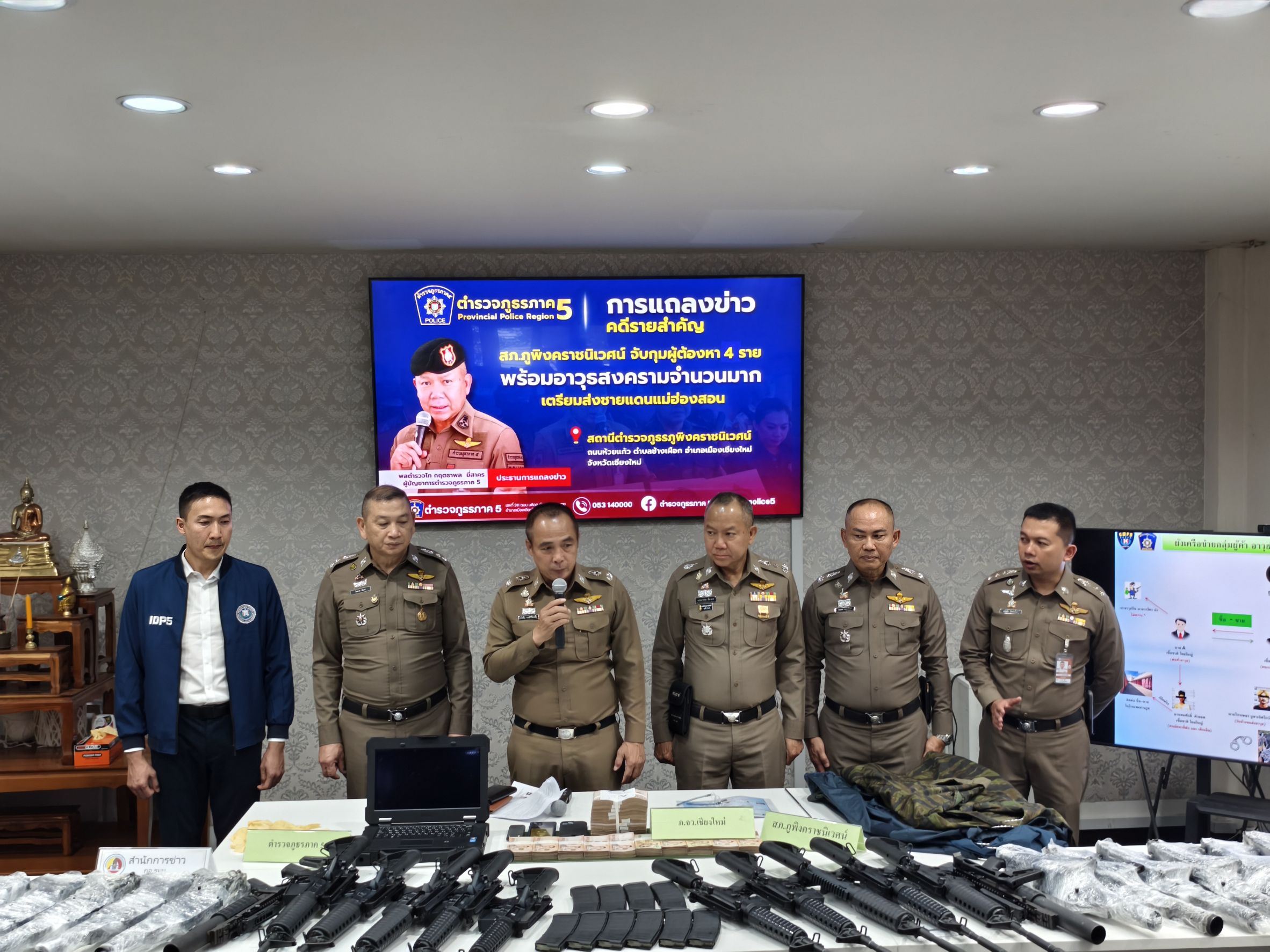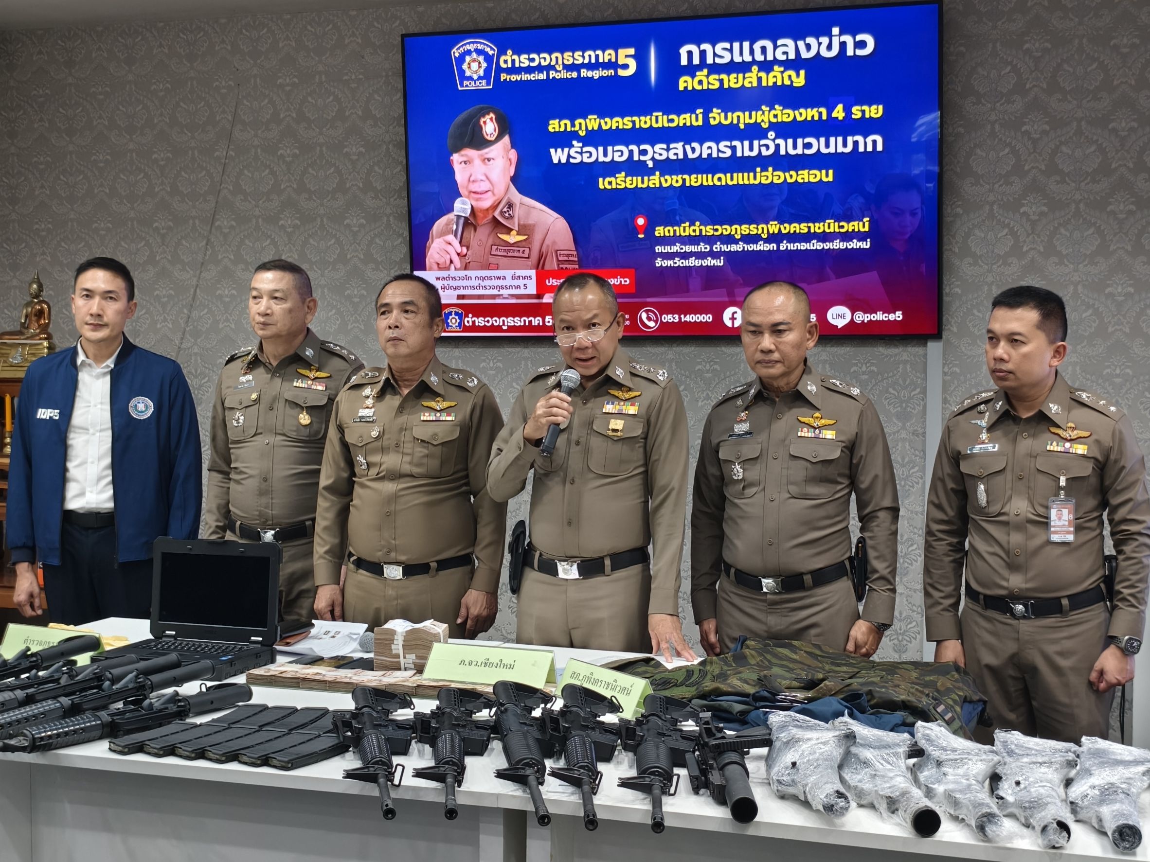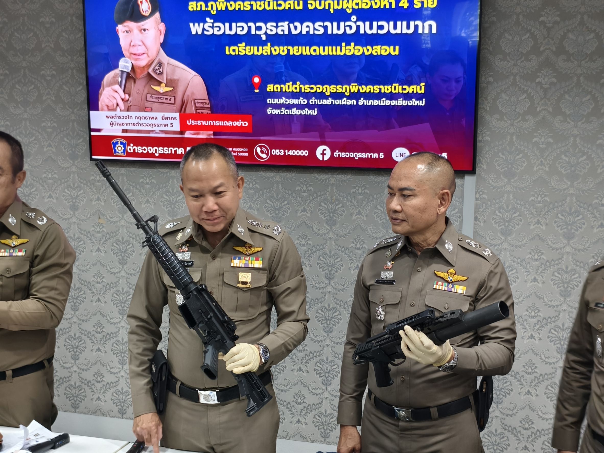 🎤 ร่วมแถลงข่าวกรณี สภ.ภูพิงคราชนิเวศน์ ร่วมจับกุมตัวผู้ต้องหาจำนวน 2 ราย พร้อมด้วยของกลางอาวุธปืนสงคราม เป็นจำนวนมาก เตรียมนำส่งชายแดนจังหวัดแม่ฮ่องสอน เมื่อวันที่ 22 เมษายน 2568 ณ จุดตรวจ สภ.ภูพิงคราชนิเวศน์ ข่วงเกษตรอินทรีย์ ถนนคันคลองชลประทาน ขาออก ต.สุเทพ อ.เมือง จ.เชียงใหม่