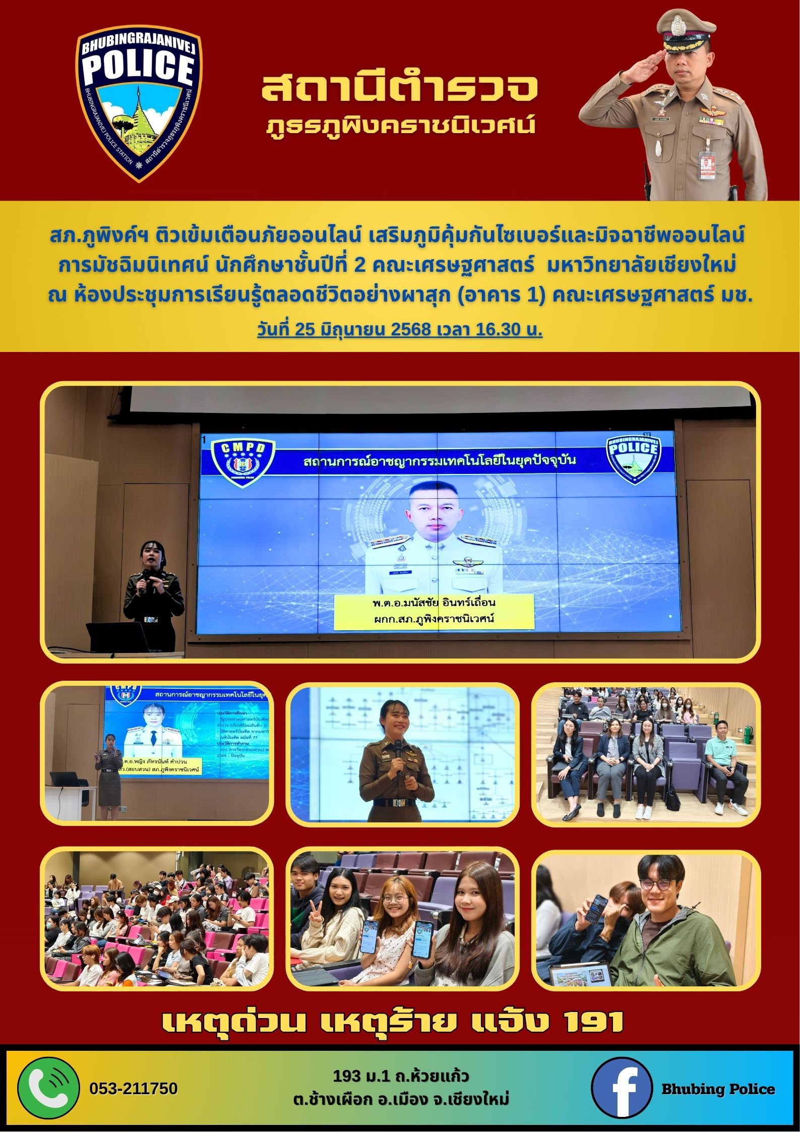 🔸เป็นวิทยากรบรรยายเตือนภัยเสริมภูมิคุ้มกันไซเบอร์และมิจฉาชีพออนไลน์ เพื่อให้นักศึกษาเกิดความตระหนักรู้เรื่องภัยมิจฉาชีพ ในการมัชฉิมนิเทศ์ นักศึกษาชั้นปีที่ 2 คณะเศรษฐศาสตร์ มหาวิทยาลัยเชียงใหม่ โดยมีนักศึกษาชั้นปีที่ 2 จำนวน 260 คน ร่วมรับฟัง