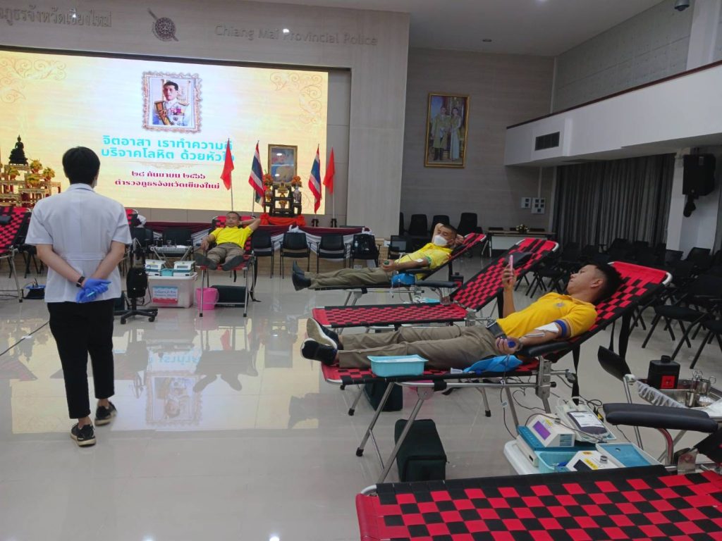 วันที่ 28 กันยายน 2566 เวลา 09.00 น. พล.ต.ต.ธวัชชัย พงษ์วิวัฒนชัย ผบก.ภ.จว.เชียงใหม่ ได้นำกำลังข้าราชการตำรวจในสังกัด ภ.จว.เชียงใหม่ ประกอบด้วย สภ.เมืองเชียงใหม่ แม่ปิง, ภูพิงค์, ช้างเผือก, เชียงดาว, แม่แตง, สะเมิง, พร้าว, แม่ออน, แม่แฝก, แม่โป่ง,หนองตอง กลุ่มงานจราจร ภ.จว.เชียงใหม่ , ฝอ.ภ.จว.เชียงใหม่ จัดกิจกรรมบริจาคโลหิตเพื่อใช้ในการรักษาผู้ป่วยที่มีความจำเป็น และเตรียมการรองรับภัยพิบัติอื่นๆ ณ หอประชุม ภ.จว.เชียงใหม่ ชั้น 2 มีกำลังพลร่วมกิจกรรม 88 นาย จำนวนโลหิต 21,600 ซีซี โดยมีงานธนาคารเลือด โรงพยาบาลมหาราชนครเชียงใหม่เป็นผู้รับบริจาคโลหิต