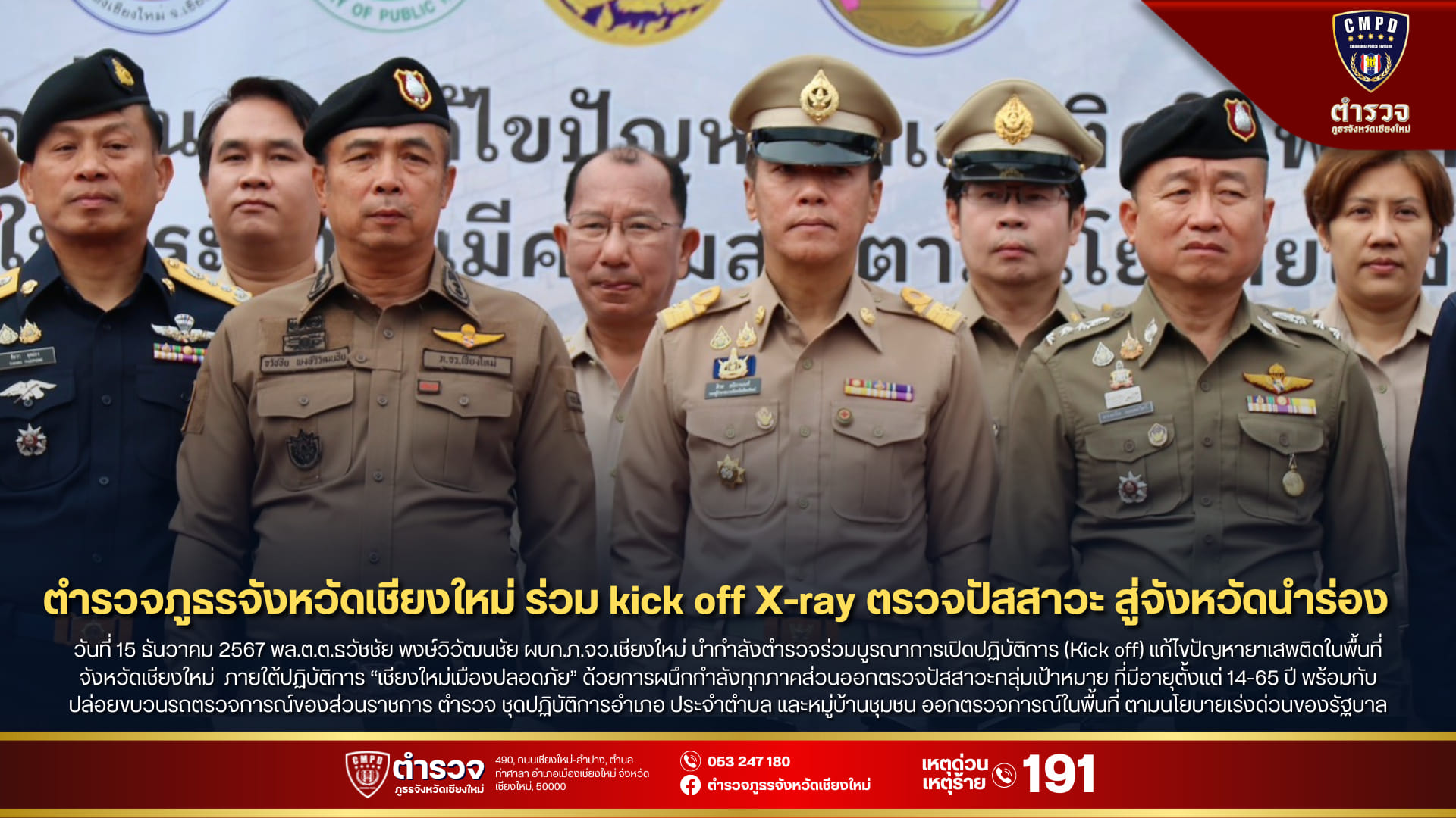 ร่วมบูรณาการเปิดปฏิบัติการ (Kick off) แก้ไขปัญหายาเสพติดในพื้นที่จังหวัดเชียงใหม่ ภายใต้ปฏิบัติการ “เชียงใหม่เมืองปลอดภัย” ด้วยการผนึกกำลังทุกภาคส่วนออกตรวจปัสสาวะกลุ่มเป้าหมาย ที่มีอายุตั้งแต่ 14-65 ปี พร้อมกับปล่อยขบวนรถตรวจการณ์ของส่วนราชการ ตำรวจ ชุดปฏิบัติการอำเภอ ประจำตำบล และหมู่บ้านชุมชน ออกตรวจการณ์ในพื้นที่ ตามนโยบายเร่งด่วนของรัฐบาลที่จะดำเนินการแก้ไขปัญหายาเสพติดอย่างเด็ดขาดและครบวงจร โดยมีนายศิวะ ธมิกานนทน์ รองผู้ว่าราชการจังหวัดเชียงใหม่ เป็นประธานในพิธี