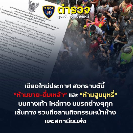 เชียงใหม่ประกาศ สงกรานต์นี้ “ห้ามขาย-ดื่มเหล้า” และ ”ห้ามสูบบุหรี่“ บนทางเท้า ไหล่ทาง บนรถต่างๆทุกเส้นทาง รวมถึงลานกิจกรรมหน้าห้างและสถานีขนส่ง