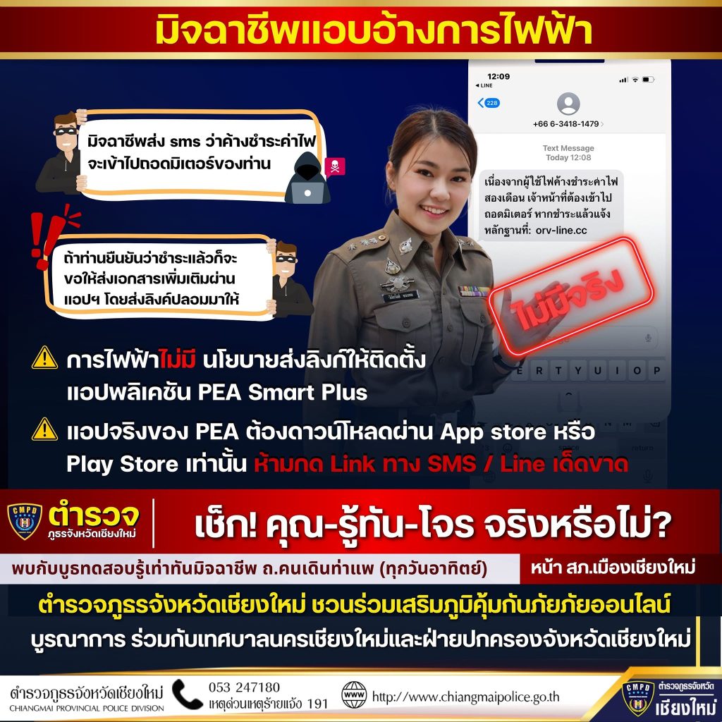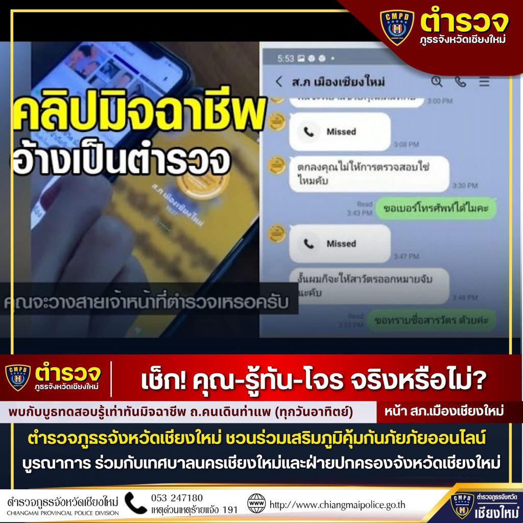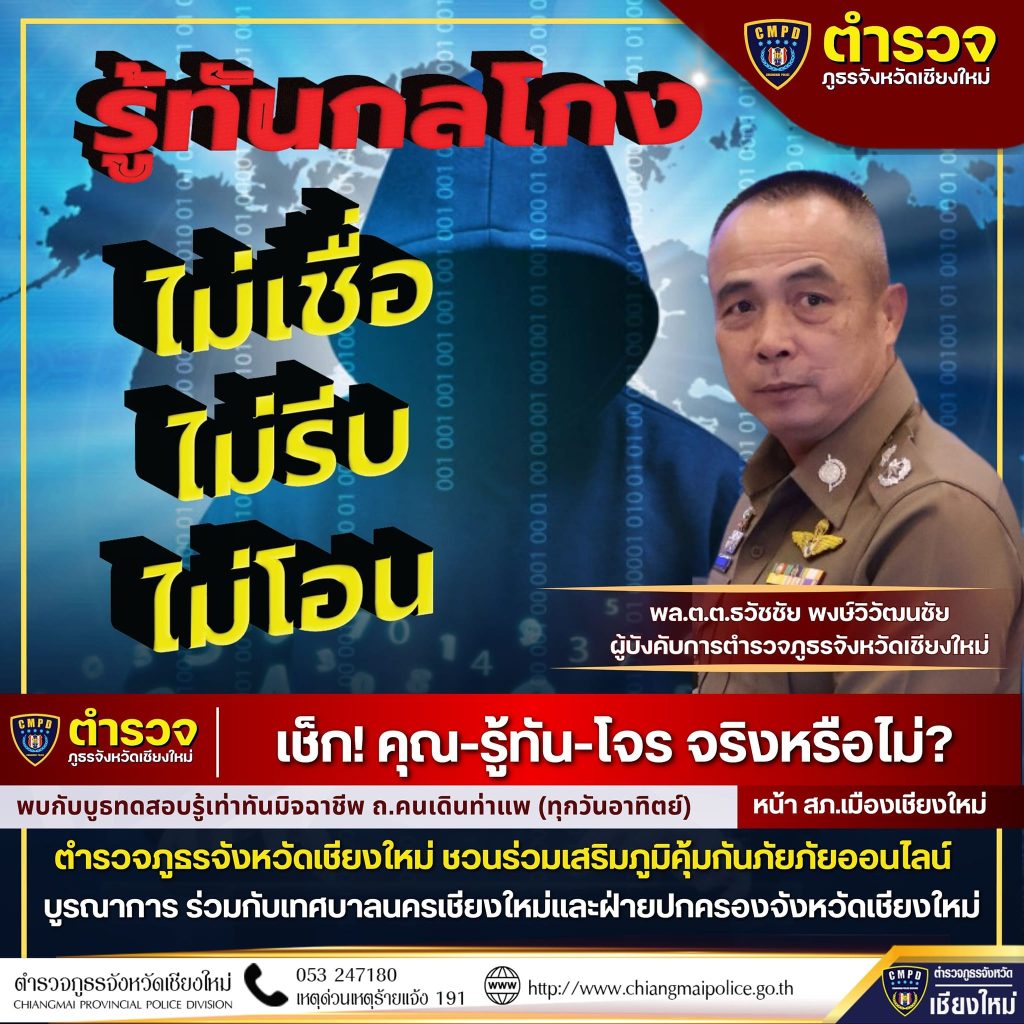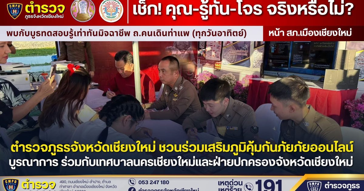 ตำรวจภูธรจังหวัดเชียงใหม่ (CMPD) บูรณาการ ร่วมกับเทศบาลนครเชียงใหม่และฝ่ายปกครองจังหวัดเชียงใหม่ เปิดบูธทดสอบความรู้ กลโกงออนไลน์เสริมภูมิความรู้ สู้ขบวนการมิจฉาชีพที่มีวิธีการที่แนบเนียนขึ้น ณ บริเวณหน้า สภ.เมืองเชียงใหม่ ในถนนคนเดินทุกวันอาทิตย์