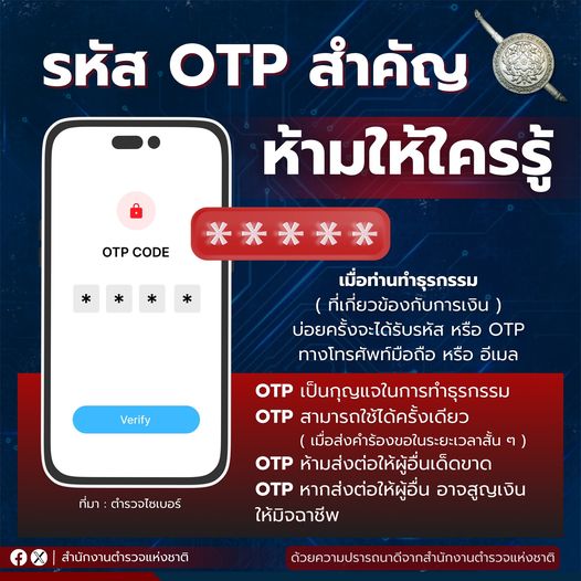 รหัส OTP อย่าให้ใครรู้ เพราะนี่คือกุญแจสู่การทำธุรกรรม ( ทางการเงิน ) ของท่าน หากตกอยู่ในมือมิจฉาชีพ