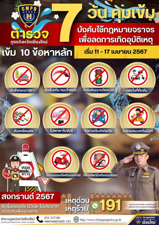 ตำรวจภูธรจังหวัดเชียงใหม่ ห่วงใยทุกชีวิตบนถนน บังคับใช้กฎหมายจราจร 10 ข้อหาหลัก เพื่อลดการเกิดอุบัติเหตุ เพื่อความปลอดภัยของทุกท่าน