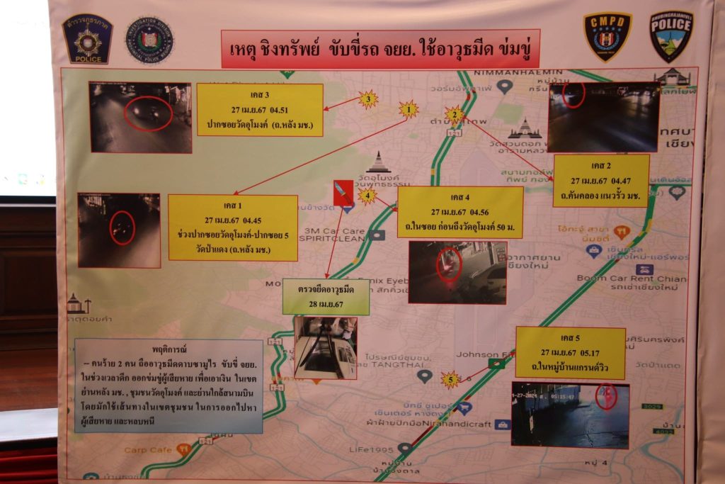 กรณีเหตุผู้ต้องหาก่อเหตุชิงทรัพย์ ย่านถนนคันคลองชลประทาน ถนนสุเทพหลังมหาวิทยาลัยเชียงใหม่ ชุมชนวัดอุโมง ต่อเนื่อง ถนนในหมู่บ้านแกรนวิว รวม 5 เคส ผู้เสียหาย 5 คน